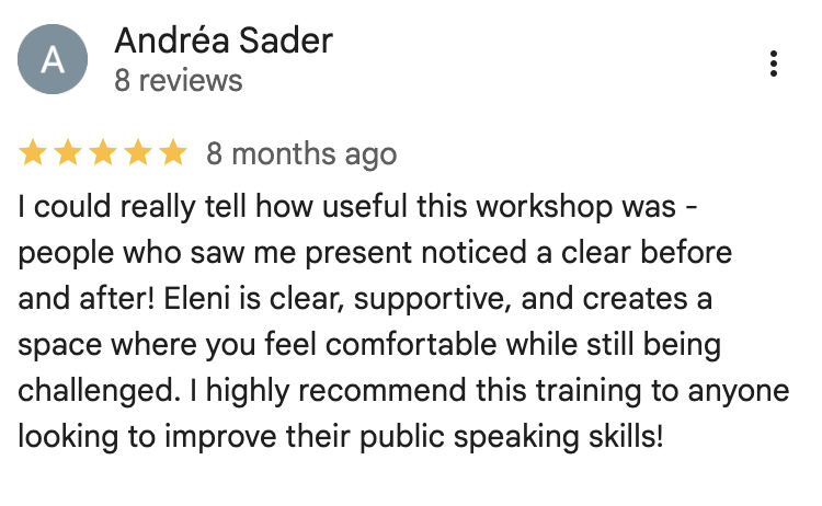 "The 6 week training allowed me to overcome the stress I had when speaking in public and not to hear my heart beat as if it was going to explode. I was able to present in a professional way and felt I had more impact during my meetings and presentations." Sofia