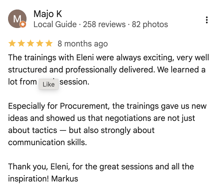 "I very much liked the CPVM model and especially the practical ways in which our trainer, Eleni Theocharopoulos, applied that model to the training process. I also appreciated a lot the rich feedback I got from her as well as her customized approach. The group dynamics were also managed pretty constructively which added extra value to the training. This 2-day training has been an intensive, constructive and memorable learning experience for me! Thank you." Angelo Alexopoulos, CERN