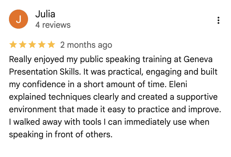 " I have been coached by Geneva Presentation Skills for three months prior to making an important presentation. The presentation went very well and I would strongly recommend any professional in the Geneva area who needs to improve presentation skills to attend the course. Eleni Theocharopoulos and her capable team explain in simple terms what is required and the video playback is particularly beneficial."