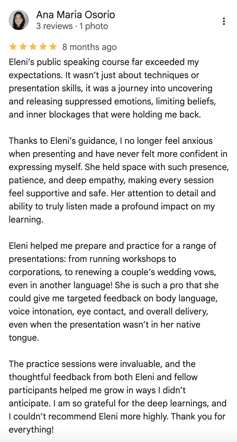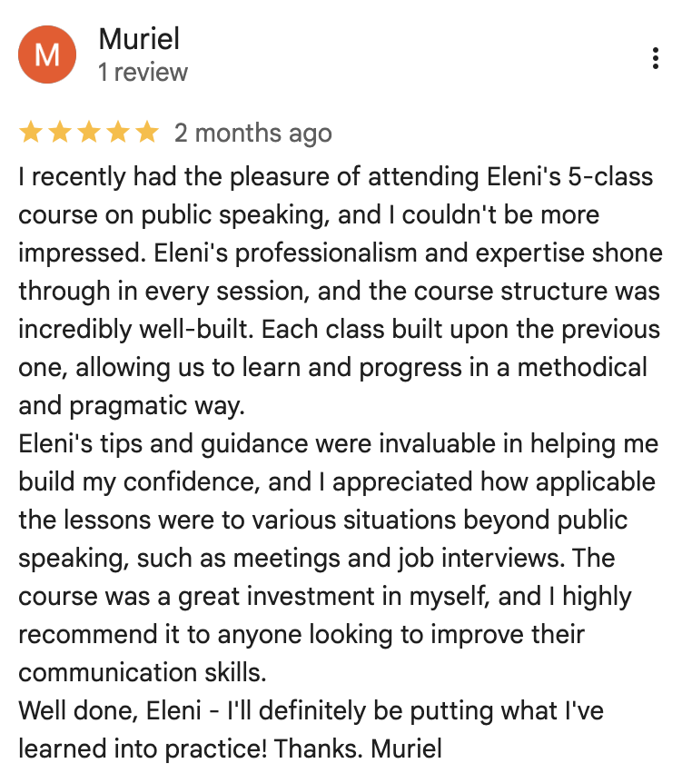 "The 6 week training allowed me to overcome the stress I had when speaking in public and not to hear my heart beat as if it was going to explode. I was able to present in a professional way and felt I had more impact during my meetings and presentations." Sofia