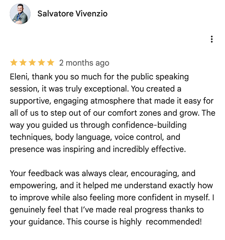 "Presentation skills course helped me A LOT to be more confident in my job interviews and when is required for me to present myself and talk to small or even bigger audiences." Konstantinos Thithizoglou, MSC